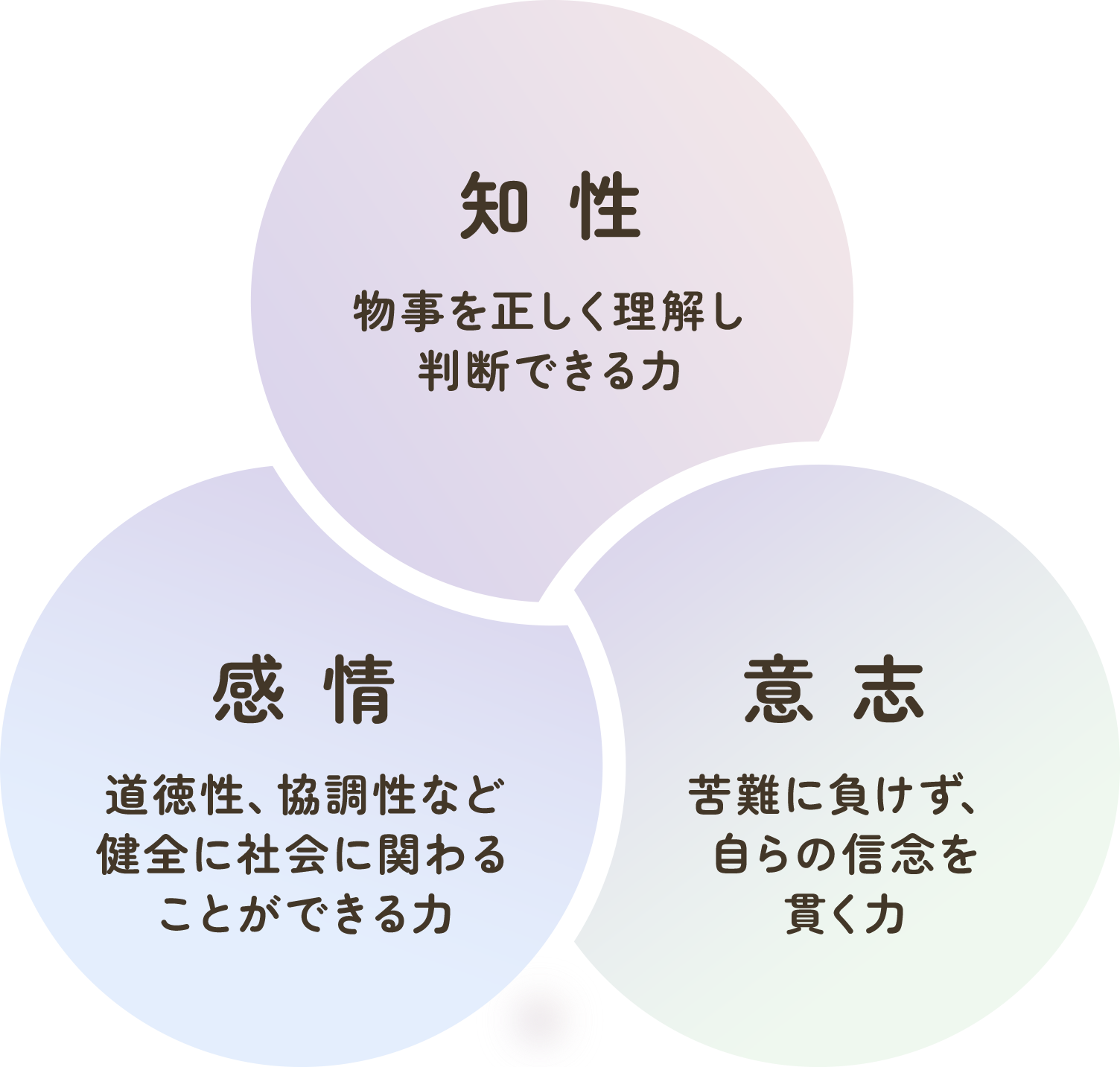 教育の分野では、それらを「知(知性)、情(感情) 、意(意志) 」の三力として、その全てを兼ね備えた人間を知・情・意の「全人(ぜんじん=調和のとれた人)」と呼び、教育が目指す理想的な人間像としました。