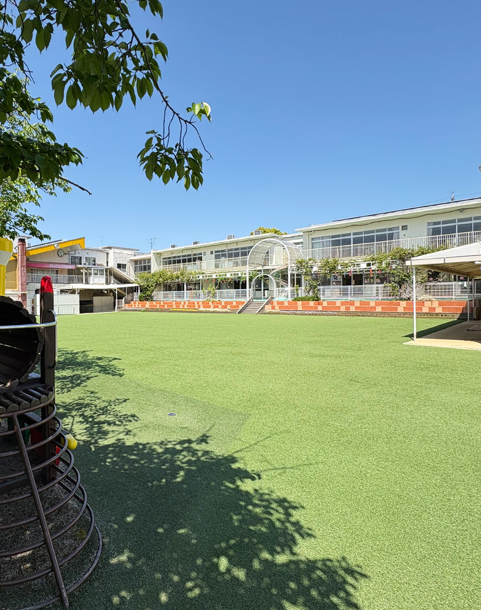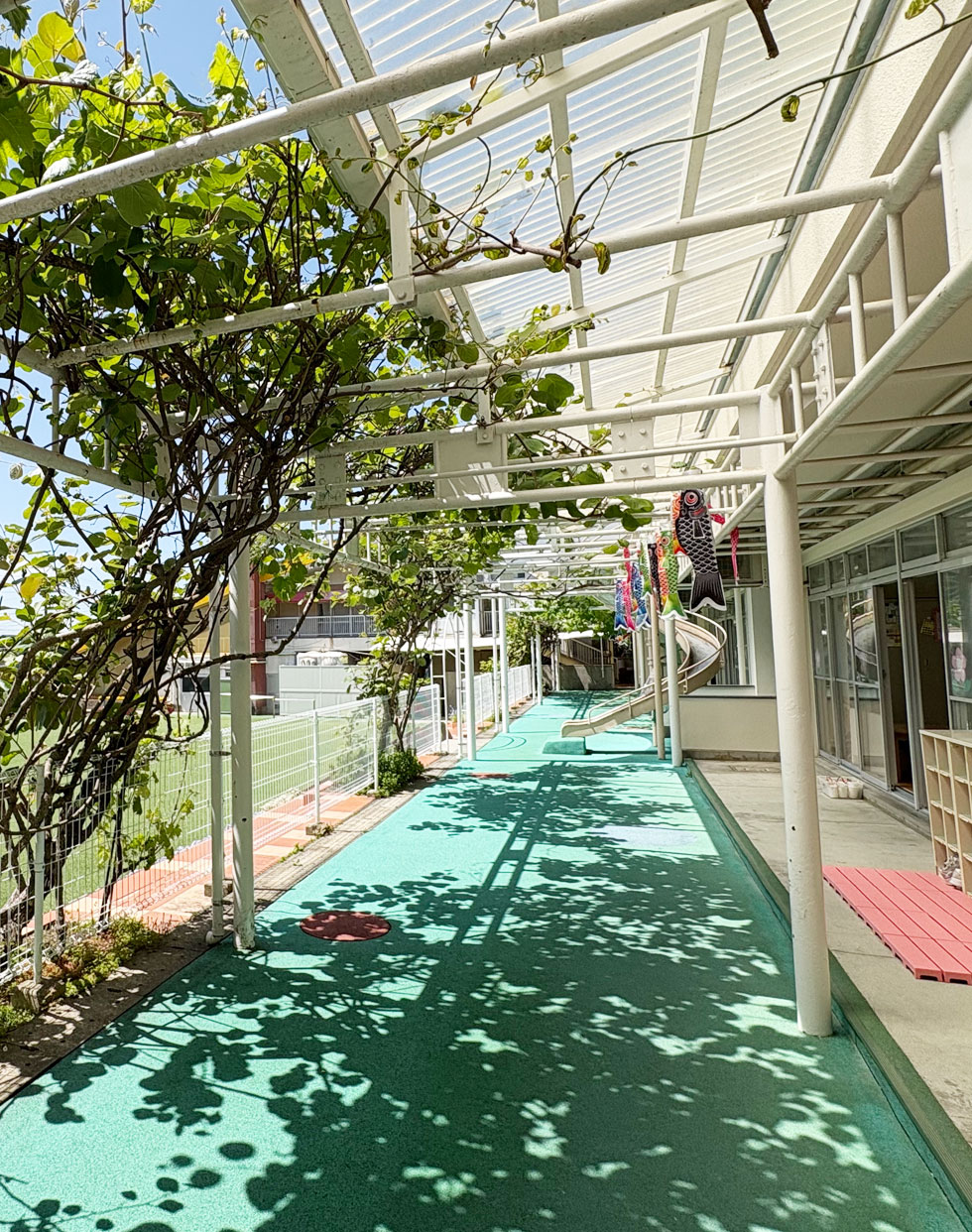 園庭での外遊びは、子どもに開放感と自由な発想を与えます。