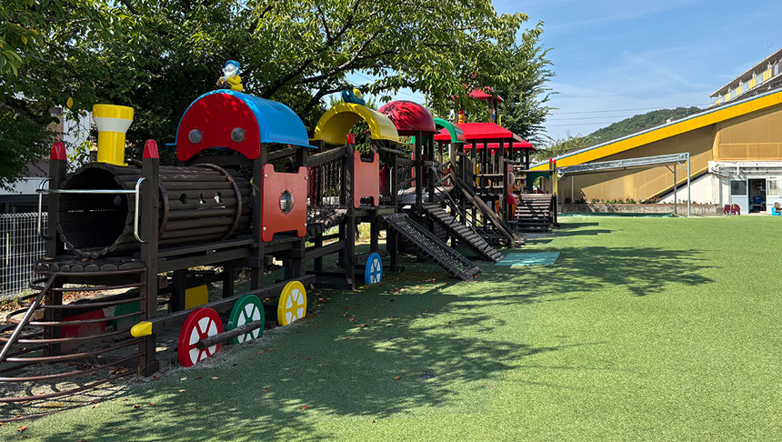 子どもの身体能力が高まる汽車型大型遊具(登り棒、すべり台など)があります。また、乗り物(3人乗り三輪車など)や砂場、鉄棒といった遊具もとても充実しています。