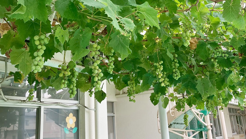 季節を感じられる花々やセキセイインコ、熱帯魚などの飼育、テラスの棚にはぶどうやキウイも実ります。