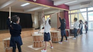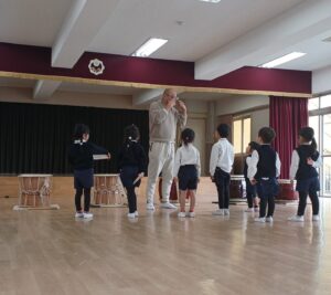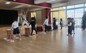 今日は、ひよこ組、年少組、年中組さん対象の和太鼓体験教室がありました。