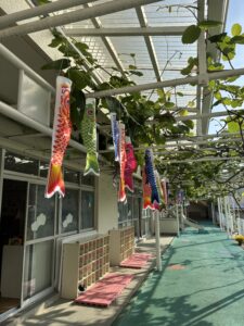 幼稚園のテラスにこいのぼりが気持ちよさそうに泳ぐ季節になりました🎏